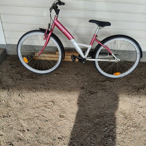 Tunturi lasten polkupyörä, 24" renkaat. Punainen runko, vaaleat renkaat ja mustat lokasuojat. Pyörässä on matala runko helpottamaan kyytiin nousua, Shimano Nexus -vaihdekahva, käsijarrut, seisontatuki sekä takatavarateline. Pyörän oma lukko ei toimi. Soittokello uusittu.