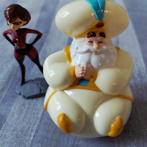 Myydään kaksi harvinaista vintage Disney-keräilyfiguuria:Ilkeä Kuningatar (Lumikki): Mukana tulevat alkuperäiset lisävarusteet: keltainen pata ja laboratoriopullo. Julkaistu vuonna 2003 (McDonald’s Happy Meal -sarja).Jafar (Aladdin): Klassinen pahis sauvalla. Julkaistu vuonna 2002 ("100 Years of Magic" -kokoelma).Molemmat hahmot ovat ikäänsä nähden erittäin hyvässä kunnossa. Värit ovat kirkkaat ja hahmot pysyvät hyvin pystyssä. Täydellinen lisä Disney-keräilijälle tai retro-lelujen ystävälle.