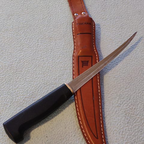 Pituus 25cm, terä 13cm, nahkatuppi Fiskars logolla ja Corp 1967 tekstillä, pieni rako helan ja kahvan välissä