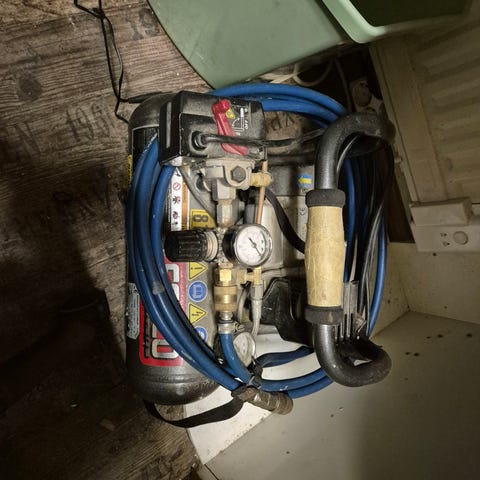 Stanley ilmakompressori kiinteällä vaakasäiliöllä. Laitteessa on kaksi painemittaria, paineensäädin, kantokahva sekä pyörät ja tukijalka siirtämistä varten. Kompressori soveltuu paineilmatyökalujen, renkaiden ja muiden paineilmaa vaativien kohteiden täyttöön ja puhdistukseen. Runko on keltainen ja moottoriyksikkö musta. Varustettu sähköjohdolla ja paineilmaletkulla liitäntöineen kuvien mukaisesti.