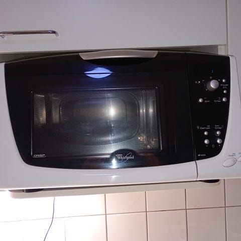 1,5 v käytössä ollut Whirlpoolin mikroaaltouuni. Jäi tarpeettomaksi keittiöremontin takia.