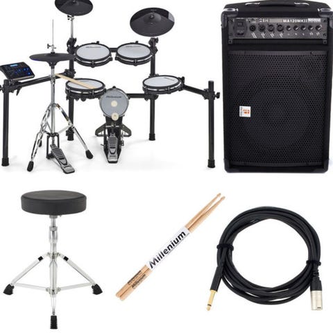 Parin viikon alkuinnostuksen jälkeen sisustuselementin rooliin jäänyt mesh-pädeillä varustettu sähkörumpusetti, jossa mukana: