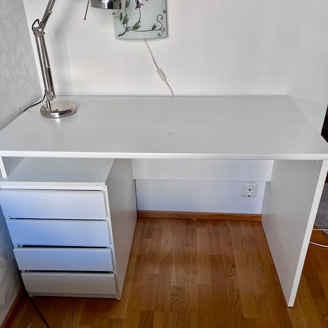 Myydään valkoinen reilun kokoinen työpöytä kahdella vetolaatikolla.