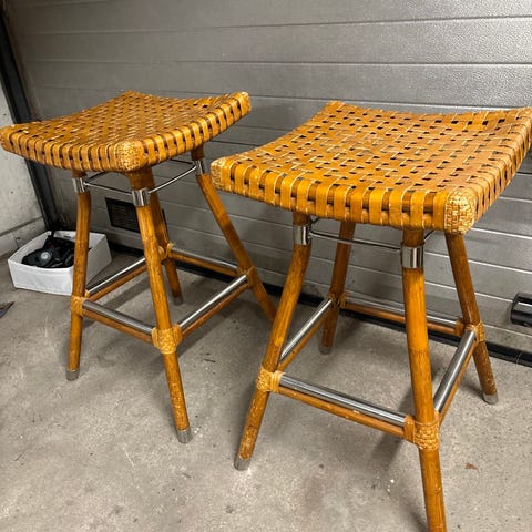 Kaksi kappaletta vanhoja rottinkisia baarijakkaroita. Ovat toimineet meillä kukkatasoina.