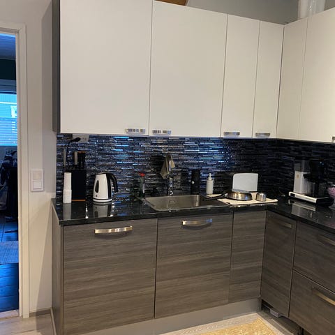 Kaapit hyväkuntoisia, joten säästämme keittiön oikean sivun sellaisenaan, mutta seinän purkamisen myötä vasemman sivun kaapisto nyt myyntiin.
