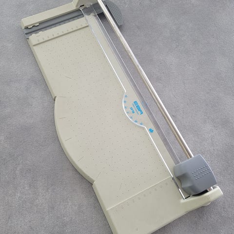 M+R Trim Cat metallinen paperileikkuri, jossa on mitta-asteikot ja leikkauslinjojen apuviivat alustassa. Leikkurissa on pitkä viputerä ja punainen kahva. Soveltuu esimerkiksi paperien, kartongin ja muiden ohuiden materiaalien leikkaamiseen kotona, toimistossa tai harrastuskäytössä. Vähänkäytetty, terä kuin uusi. Nouto Lamminpäästä tai kulkeutuu Ylöjärven Prisman suuntaan. Mobilepay.