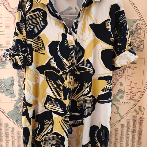 Nanson ruskea-valkea kukkakuviollinen t-paita. Mitat; edestä kauluksesta helmaan 50cm, takaa kauluksesta helmaan 60cm, kainalo-kainalo 51cm. Materiaali 49% puuvillaa, 49% modaalia ja 2% elastaania, joustaa. Koko L, muutaman kerran pidetty, uudenveroinen.