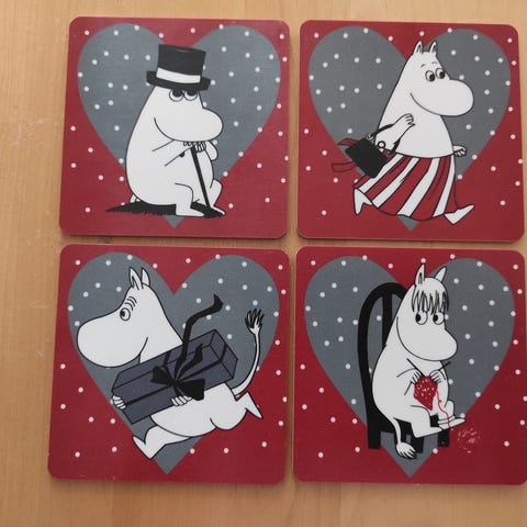 Opto Design / Scandinavian Design lasinaluset, Muumi Retro 2013. 12 kpl. Mitat 9x9 cm. Materiaali: Koivu puu. Harvoin saatavilla . Keräilyyn, koristeeksi , käyttöön, lahjaksi