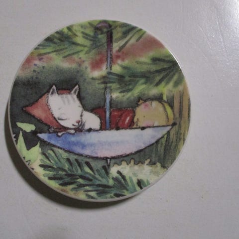 Arabia seinälautanen vuodelta 1978. Neliönmuotoinen, pyöristetyin kulmin. Valmistettu keramiikasta, etupuolella monivärinen kuvitus ja lasitus, taustapuolella teksti, valmistajamerkinnät ja vuosiluku 1978. Lautasen taakse kiinnitetty ripustuslenkki seinälle ripustamista varten.