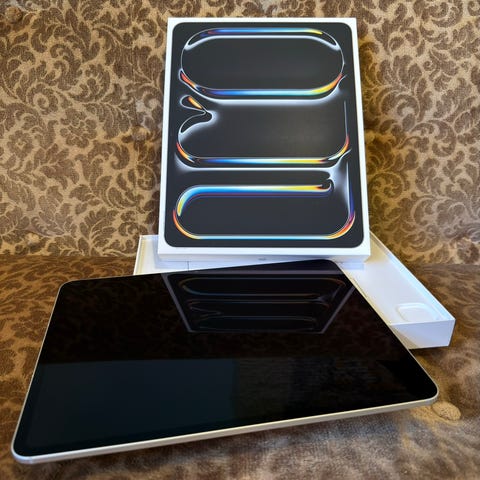 Ipad Pro M4 -tabletti, USB-C latausjohto, pikaopas, myyntipakkaus, alkuperäinen takuukuitti.