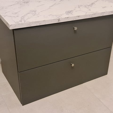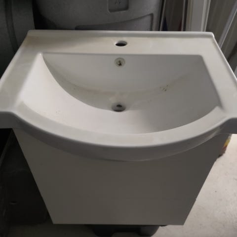 Allaskaappi jossa posliinista valmistettu yläosa ja allas. Kohtuu hyvässä kunnossa. Oikealla kolme vetolaatikkoa ja keskellä kaapit.