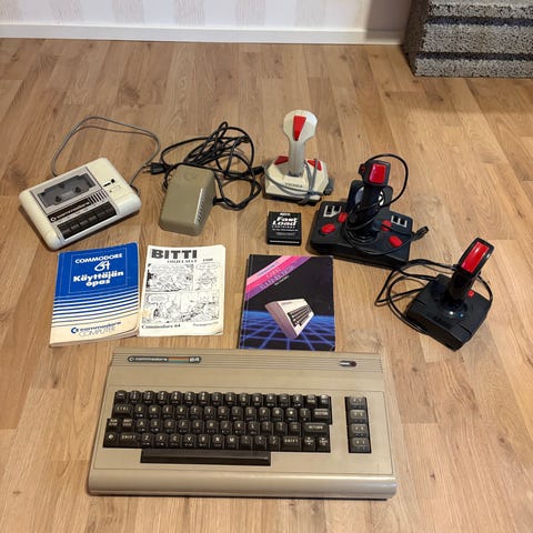 Koko paketti kerralla. 22 orkkispeliä ja joitain kopioituja. Joystick ja kasettinauhuri. Huom, ohjekirjat löytyy myös.