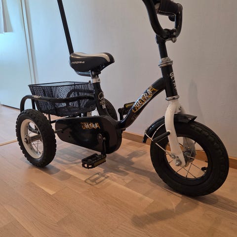 Lasten kolmipyörä työntöaisalla myynnissä.