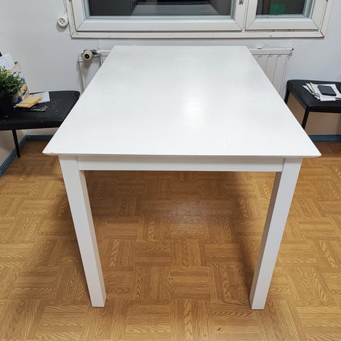 Siisti ruokaryhmä ja kuusi tuolia. Kahdessa tuolissa kankaassa hiukan puhdistettavissa olevaa tahraa.