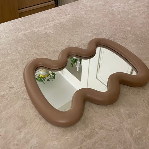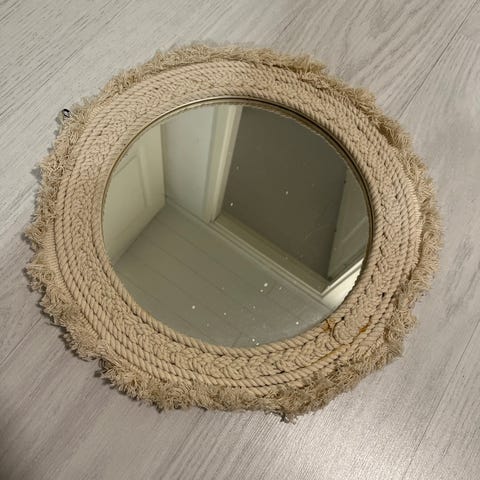 H&M Home peili, jossa suorakulmainen muoto ja pyöristetyt kulmat. Peilissä on vaalea puujäljitelmäkehys. Sopii käytettäväksi esimerkiksi eteisessä, makuuhuoneessa tai muussa sisätilassa seinä- tai lattia peilinä kodin sisustuksessa. Koko: L54 K86.