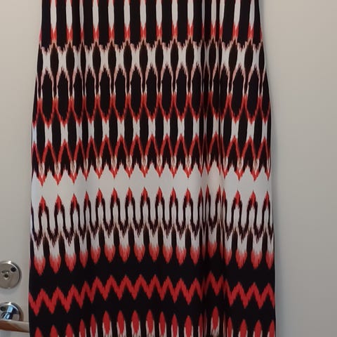 Täyspitkä itse ommeltu vuoriton kesämekko. Kankaassa paisley-kuviointi. Yksissä juhlissa vain pidetty. Koko arviolta S tai pieni M.