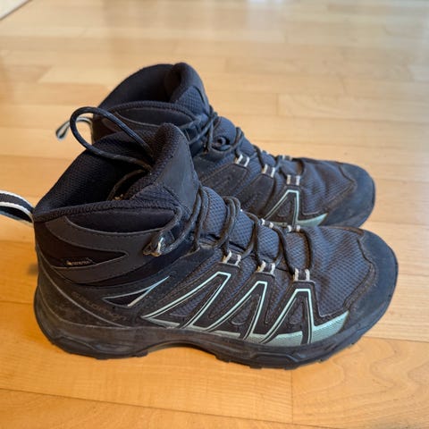 Salomon vaelluskengät, koko 40. Väriltään mustat, heijastavin ja vaalein yksityiskohdin. Kengissä on Gore-Tex -kalvo, joka tekee niistä vedenpitävät ja hengittävät. Päällinen on tekstiiliä ja synteettistä materiaalia, pohja kuvioitu ulkokäyttöön. Sopivat vaellukseen, retkeilyyn ja muuhun ulkoiluun.