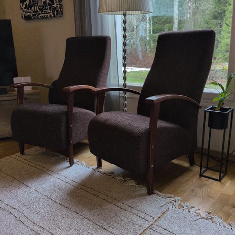 Nahkaiset siniset nojatuolit. normaali istuinosa ja paksusti pehmustetut käsinojat. Materiaalina nahka, jalat puuta. Sopii olohuoneeseen tai muuhun oleskelutilaan, myös yksittäisenä istuimena, myynnissä kaksi kappaletta. Kuvassa ovat sinisemmät, kuin luonnossa. Ilmoituksessa kappalehinta.