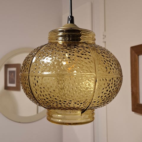 Vanha kattolamppu/plafondi. Leimikkokuviolla neliskanttinen. Hunajanvärinen lasivarjostin. Koko 22x22cm. E27 kanta. Sähköt uusittu/kunnostettu. Pistotulppa asennettu. Täysin ehjä ja toimiva.