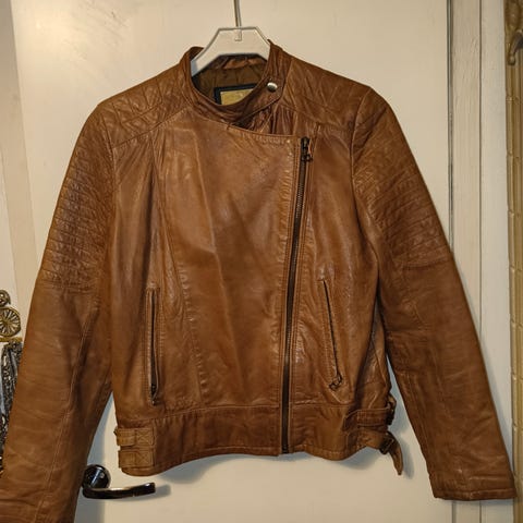 Mango nahkatakki, koko XL. Ruskea naisten malli, jossa edessä vino vetoketjukiinnitys ja useita vetoketjutaskuja. Hihansuissa vetoketjut, olkapäillä tampit ja muotoonommellut leikkaukset selkäpuolella. Materiaalina nahka, vuorillinen takki arki- ja vapaa-ajan käyttöön. Menee hameen tai housujen kanssa. Hyvä väri esim. valkoisen kanssa.