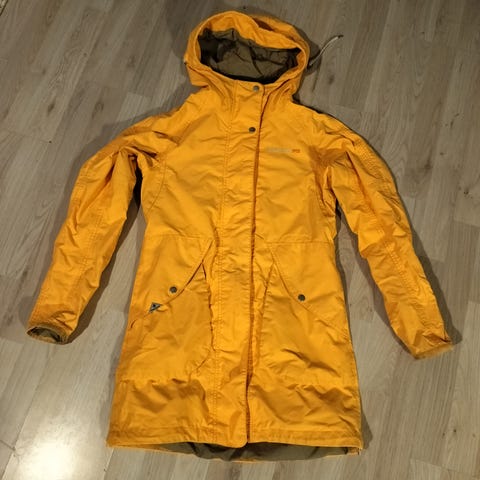 Ehjä ja siisti punainen (kuva vääristää väriä pinkin näköiseksi) vedenpitävä hupullinen naisten takki. Kiristysnyörit helmassa ja hupun reunassa, päällistaskut, vetoketjutaskut, edessä vetoketju+ tarrakiinnitys, hihansuissa tarrasäädöt. Takin pituus hartiasta helmaan noin 74 cm