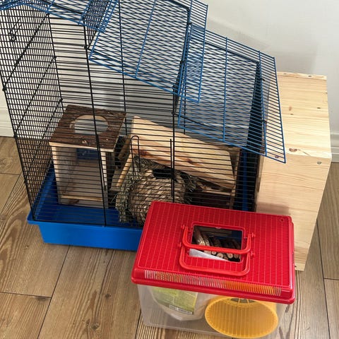 Ferplast Multy duna irrotettavalla välitasolla, mitat 71,5 (pituus) x 46 (leveys) x 31 (korkeus) cm. Mukana juomapullo, keraaminen ruokakuppi, tikapuut, koppi ja tunneli. Sopii esim. kääpiöhamsterille. Dunassa halkeama juomapullon kohdalla, ei vaikuta käyttöön. Hampaanjälkiä siellä täällä.