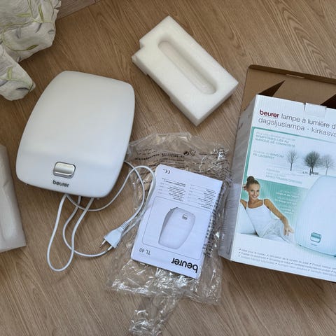 Philips kirkasvalo/herätysvalo, jossa suuri valkoinen valopinta ja jalustassa digitaalinen näyttö sekä painikkeet asetusten säätöön. Laite toimii verkkovirralla ja siinä on johdollinen virtaliitäntä. Soveltuu heräämisen ja valaistuksen tueksi pimeinä aikoina.