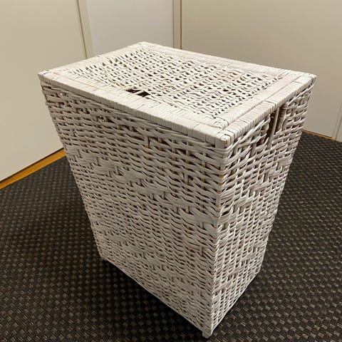 Käytetty mutta siisti pyykkikori. Toisen kangaskahvan toinen puoli irronnut.