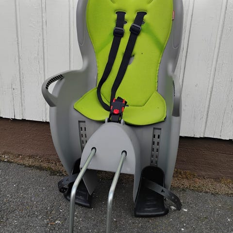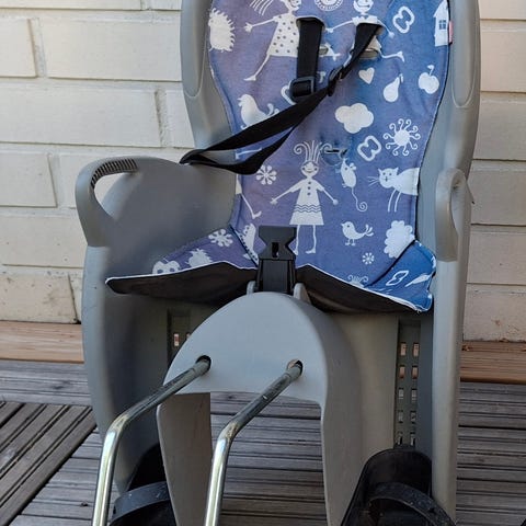 Hamax lasten pyöränistuimet, kantavuus 22 kg. Kuvissa kaksi istuinta: sininen ja musta punaisella pehmusteella. Istuimissa on säädettävät turvavyöt ja jalkatuet. Kiinnitys tapahtuu pyörän runkoon metallikaarien ja kiinnityspalan avulla. Punaisessa istuimessa kiinnityspaloja kaksi, sinisessä yksi. Punaista istuinta on siis kätevä vaihtaa pyörästä toiseen.