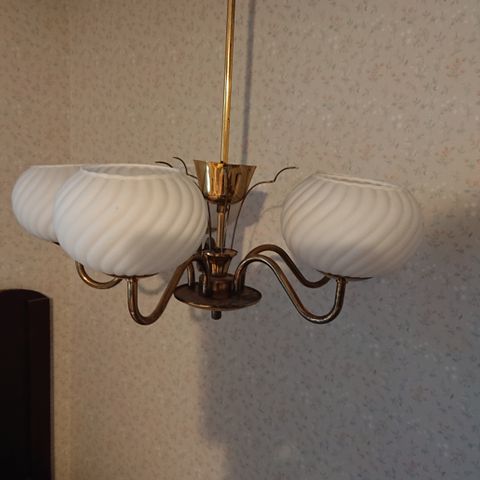 Ilmeisesti Carl Fagerlundin Orreforssille suunnittelema messinkikupuinen riippuvalaisin 60-70 luvulta. Kuvussa vain hieman ajan patinaa, muovisäleikössä joitakin tummentumia. Täysin toimiva, kolmelle polttimolle paikat. Valaisimessa pistoke. Halkaisija n. 50cm. Kysy lisää. Kulkeutuu sopimuksen mukaan Helsinkiin. Lähettämisestä sovitaan erikseen.