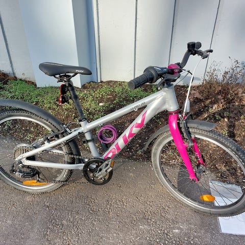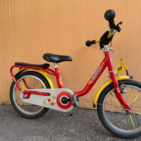 Puky lasten polkupyörä 16" renkailla. Polkupyörässä on matala runko, jalkajarru ja käsijarru edessä. Pyörässä on lokasuojat, takatavarateline sekä ketjusuoja. Satula ja ohjaustanko ovat säädettävissä. Rungossa kukkakoristeita. Mukana on erillinen työntöaisa lisäistuimella aikuisen avustettua ajoa varten. Soittokello ei toimi.
