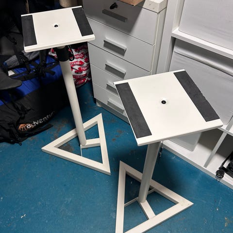 Kaksi kappaletta tukevia Gravity SP 3202 VT -kaiutinjalustoja, joissa valurautainen jalka.