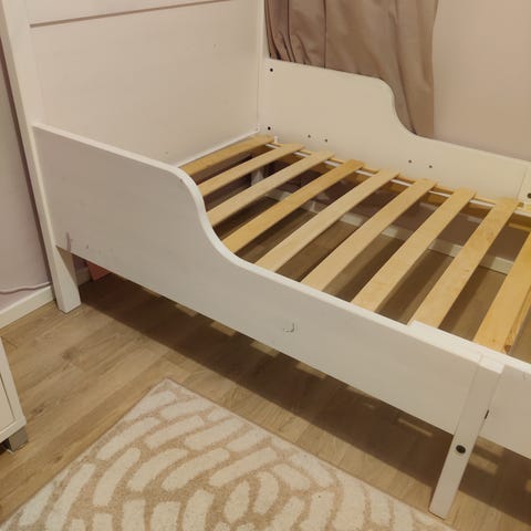 JLY tuotemerki jatkettava lastensänky. Sänky on valmistettu puusta, jossa on puunvärinen sälepohja ja valkoiset päädyt sekä laidat. Sänkyä voidaan pidentää lapsen kasvaessa.
