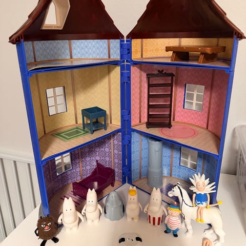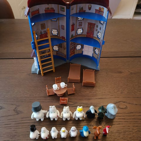 Myydään muumitalo ja kuvassa näkyvät hahmot. Talossa ei sisäpahveja, yksi tuoli tallella. Kaikki yhteensä 5euroa. Ei postitusta.