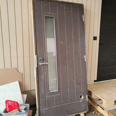Ulko-ovi varastoon, raksalla, autotalliin käyntioveksi tai muuhun sopivaan käyttöön. Oikeakätinen ( karmikuvassa kynnys on ylhäällä, otsikossa virhe), saranat ja lukko on. Ovipeili elää kosteuden mukaan joten en suosittele varsinaiseksi oveksi. Muuten hyvä kuntoinen.