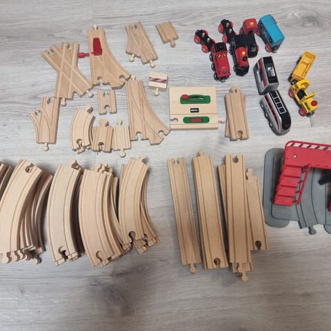BRIO (pääosin, mutta sis.myös merkittömiä) puinen junarata ja junat. Settiin kuuluu useita suoria ja kaarevia puisia ratarakennusosia sekä erilaisia vetureita (myös.patterikäyttöisiä, joista kuuluu ääni/valot), vaunuja ja ajoneuvoja. Mukana on sekä puu- että muoviosia, esimerkiksi värikkäitä junavaunuja ja hahmoja. Rataosat ovat yhteensopivia BRIO-puujunaratojen kanssa ja niistä voi koota erilaisia ratakokonaisuuksia leikkeihin.