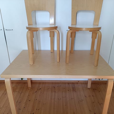 Artek Alvar Aalto ruokapöytä, halkaisija 125 cm, pyöreä malli. Pöydässä on valkoinen kansi ja puunväriset jalat. Materiaalina on puu ja laminoitu pöytätaso. Sopii ruokailutilaan tai keittiöön useamman istumapaikan pöydäksi. Muotoilu perustuu Alvar Aallon suunnitteluperinteeseen ja Artek-huonekalujen selkeään, funktionaaliseen ilmeeseen. Pientä kulumaa, ei haittaa käyttöä.