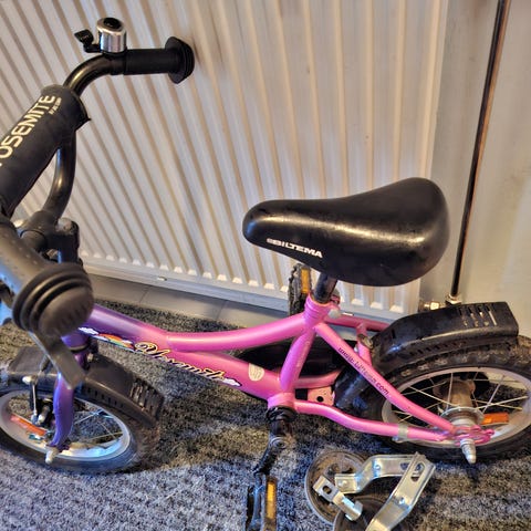 Lasten polkupyörä 12"-tuumaisilla renkailla. Runkoväri violetti, musta satula ja mustat käsigripit. Pyörässä on ketjusuoja, apupyörille kiinnityspaikat sekä heijastimet renkaissa. Sopii pienille lapsille ensimmäiseksi polkupyöräksi tai tasapainopyörän jälkeiseen käyttöön.