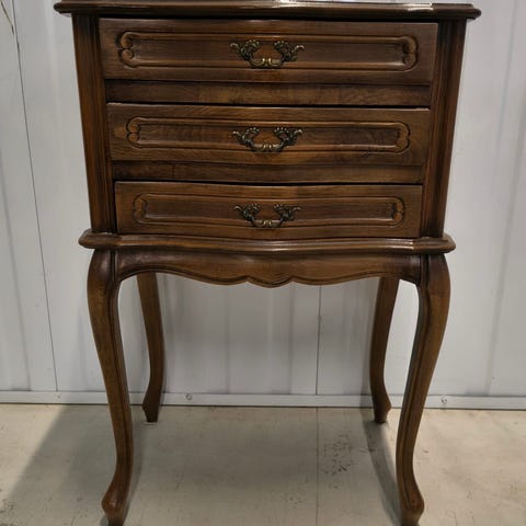 Tummaa puuta oleva pieni koristeellinen pöytä, marmorikansi. 2 laatikkoa.