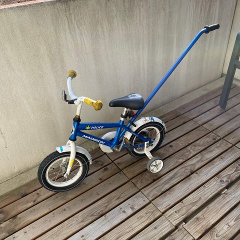 Apupyörät mukaan. Satulassa tarrasta jääny liima mutta lähtee rapsuttamalla. Kulkeutuu omien menojen mukana lähi alueille. Työntöaisan saa halutessaan mukaan.