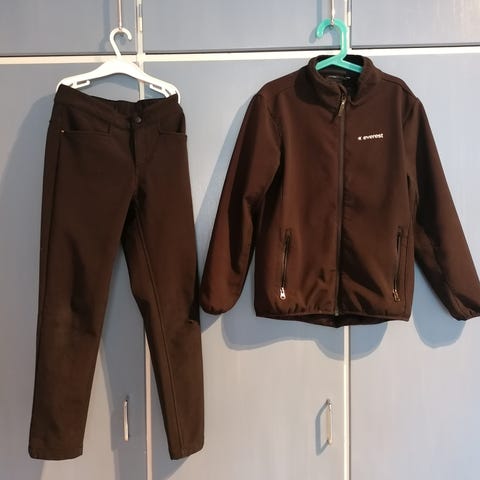 Softshell takki hyvässä käytetyssä kunnossa, aavistus pehmentymää kyynärpään kohdalla mutta yleisilme oikein siisti. Housut näyttää kaukaa hyvältä, tarkemmin katsottuna polvet pehmenneet. Käytössä vedenpitävyys polvien kohdalta varmasti kärsinyt, muuten oikein kelpo setti ulkoiluun! Yhteensä 15e (takki 10e housut 5e, myyn mieluiten settinä).