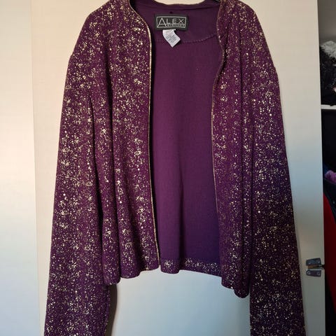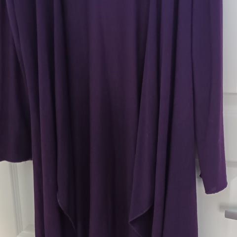 Myynnissä pari kertaa käytetty, violetti neuletakki. 60 % puuvillaa ja 40 % akryylia. Koko: XL