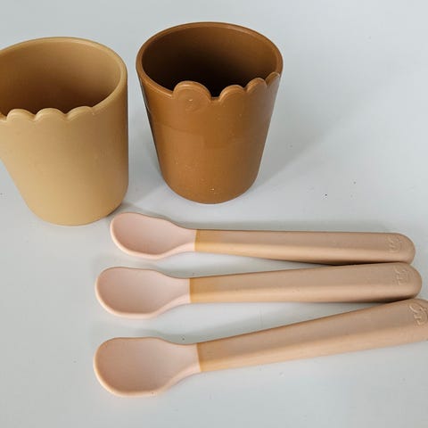 Done by Deer lasten silikonilautasset imukupilla ja Nuby syöttöpullo