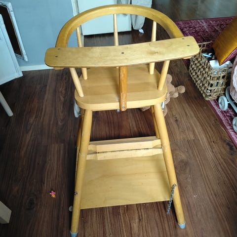Puinen lasten syöttötuoli.