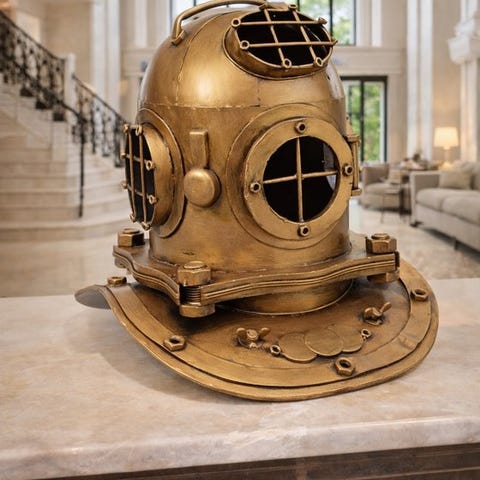 Tämä on upea 1:1 kopio historiallisesta sukelluspäähineestä Yhdysvaltain merivoimien aikakaudelta. Totta kai yksityiskohdat on jäljennetty tarkasti. Valmistettu kuparista, messinkistä ja lasista. Sen mitat ovat seuraavat (+/-):Korkeus: 44 cmLeveys: 43 cmKaikki tuotteemme lähetetään hyvin pakattuina ja vakuutuksella.