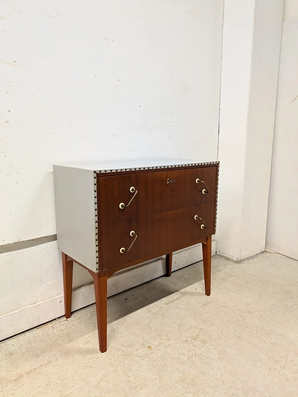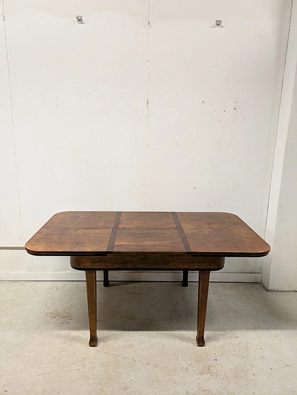 Klassinen sohvapöytä klaffipäädyin myytävänä. Kannessa muutamia jälkiä / naarmuja. Runko ehjä. Alkuperä Tanskasta. Leima pohjassa.