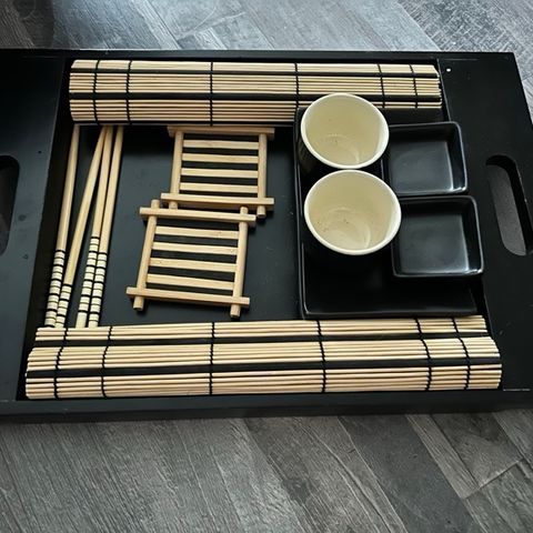 Myydään pieni sushisetti: 2 pientä kulhoa, 2 värikkäät puikot ja sushimattoja, jotka käy myös kattausalustoista.