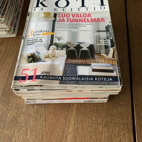 Koti ja puutarha -lehdet, useita numeroita samassa nipussa. Lehdissä käsitellään kodin sisustusta, puutarhanhoitoa, kasveja ja pihanhoitoa. Sopii esimerkiksi inspiraation ja ideoiden etsimiseen kotiin ja puutarhaan. koko pino 5€