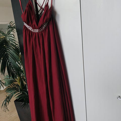 Vila ilta- tai juhlapuku, naisten mekko koossa M. Mekko on sininen ja valmistettu polyesteristä. Malli on hihaton, leveillä olkaimilla ja suoralla, pitkähköllä helmalla. Yläosassa on hillittyä koristetikkausta. Sopii juhla- ja iltatilaisuuksiin tai muihin siistimpiin menoihin.