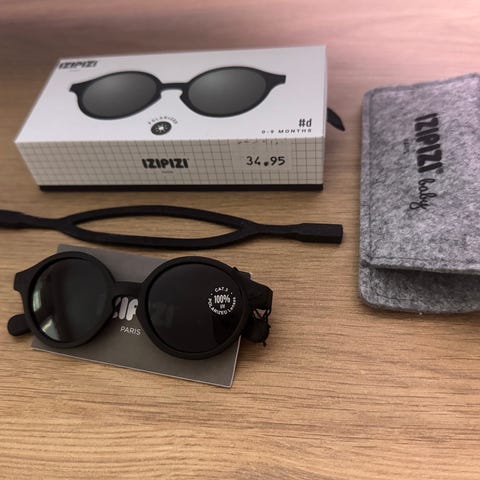 Izipizi vauvan aurinkolasit. 0-9 kk. Hyväkuntoiset vauvan aurinkolasit. Lasit ovat naarmuttomat, mukaan takanauha ja pehmeä säilytyskotelo. Lasien alkuperäinen pahvikotelo myös, se on vain saanut vähän kosteutta.